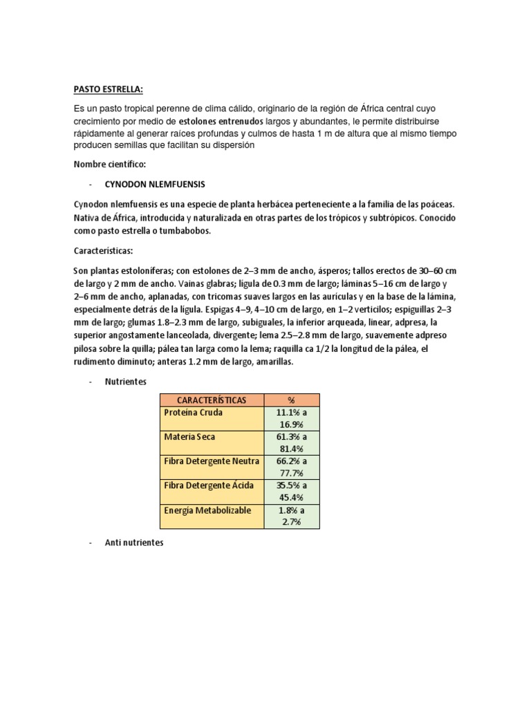 El pasto estrella africa na cynodon nlemfuensis es una de estas especies que tanto por sus caracterfsticas de adaptacion como nutricionales es muy utilizada en los sistemas ganaderos de leche. Pasto estrella en prefloración. El pasto estrella presenta buenos valores de proteína bruta y digestibilidad si es cortado a edades tempranas 30 42 días y si se le aplica altas dosis de fertilizante 400 kg ha año.
